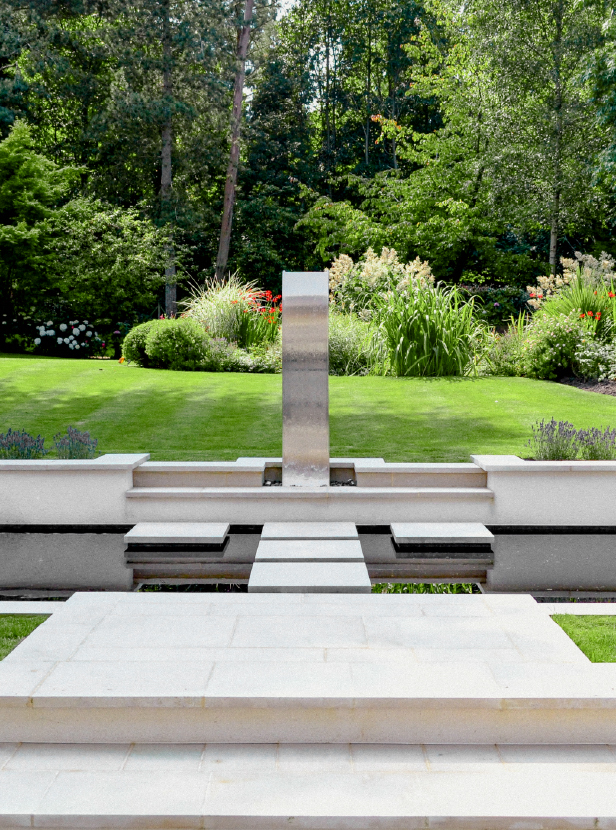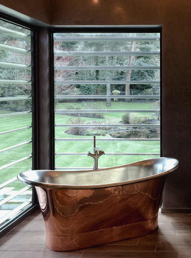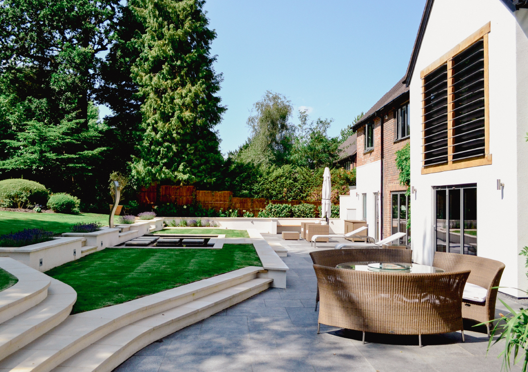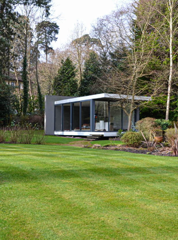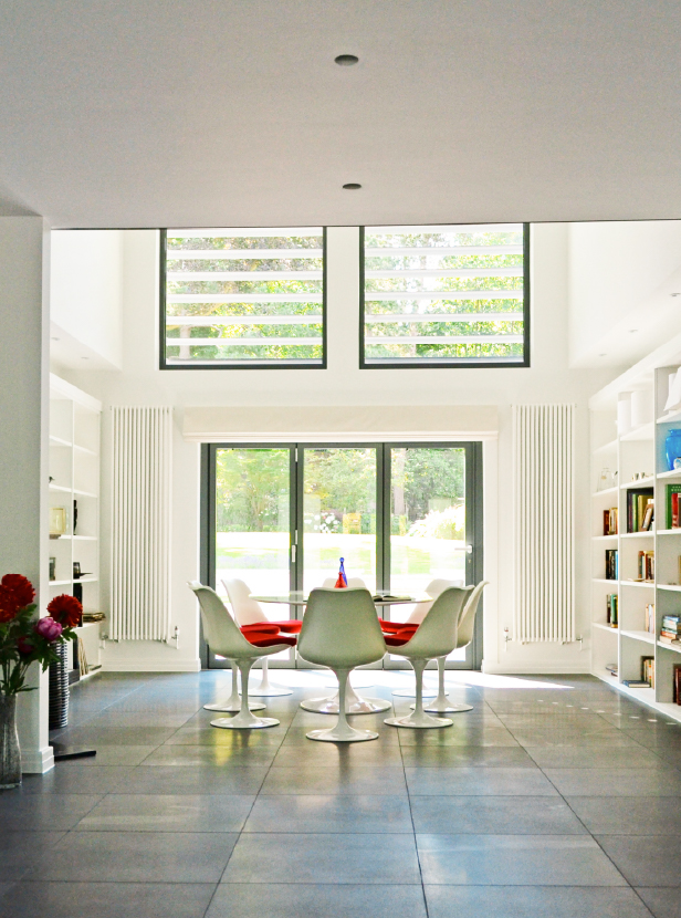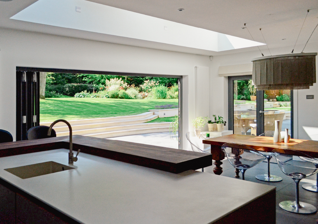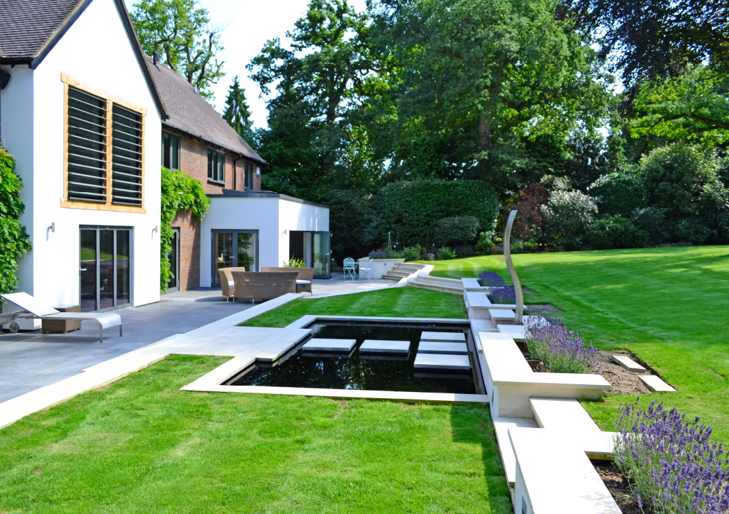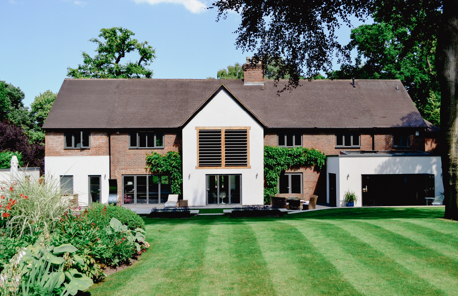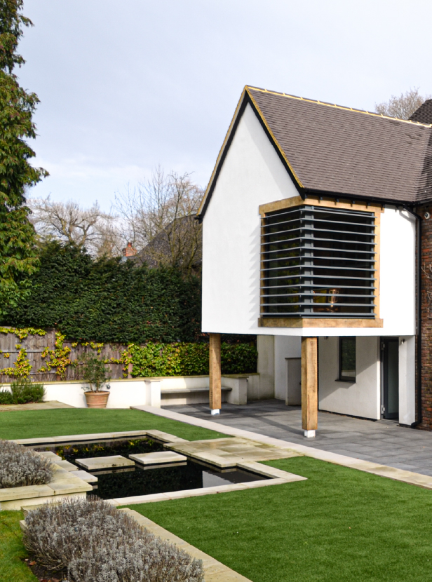 The powder coated metal louvres in front of the large feature windows combined with the new external finishes, give this house a modern look and give the impression that the whole house is a new build. We also designed a Mies van der Rohe inspired garden pavilion which with its raised platform overlooks the secluded and beautifully laid out gardens.
