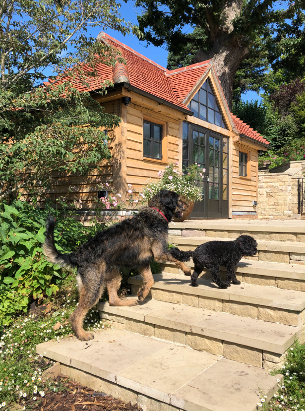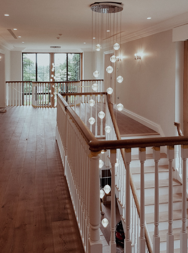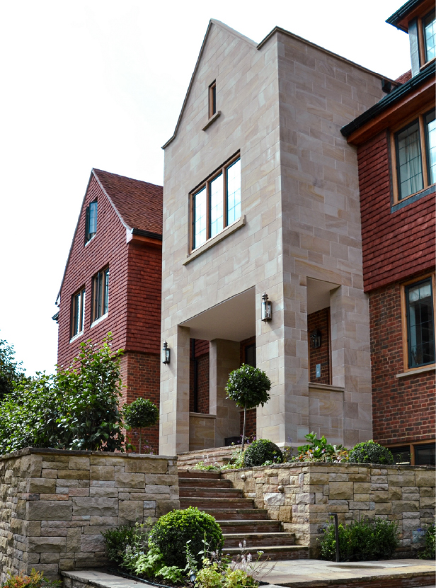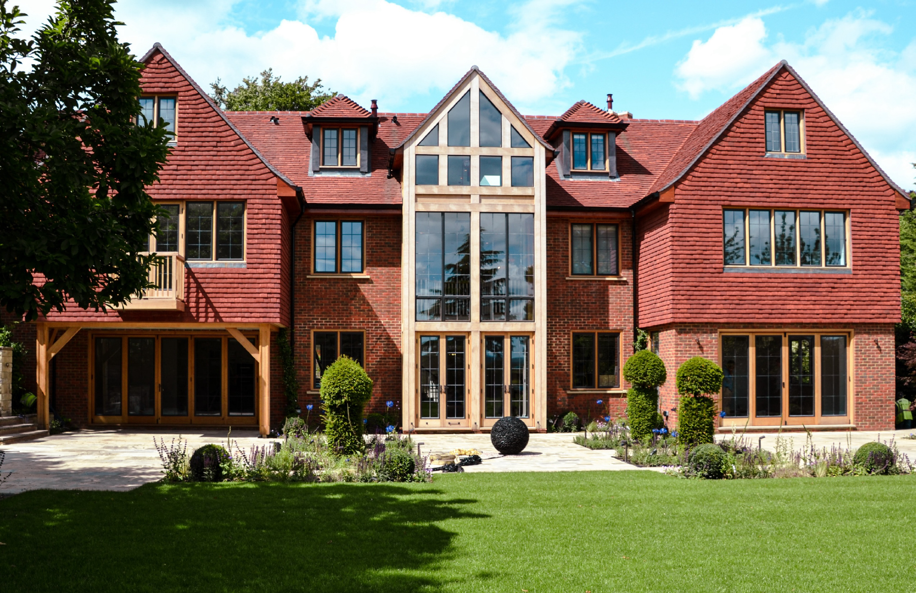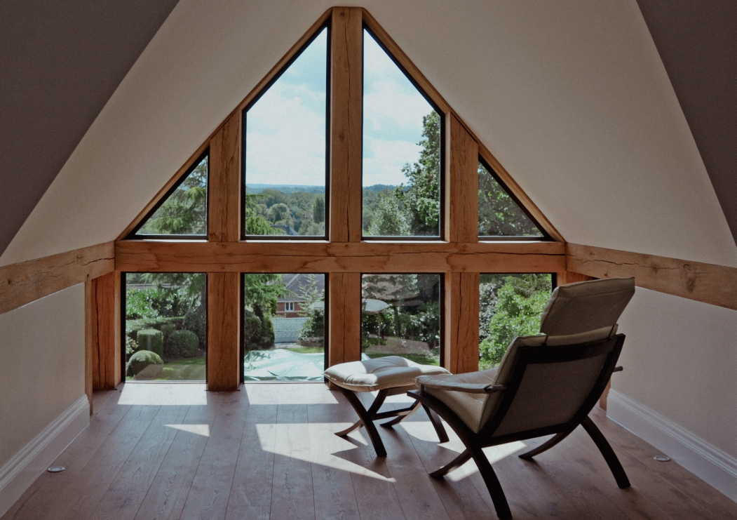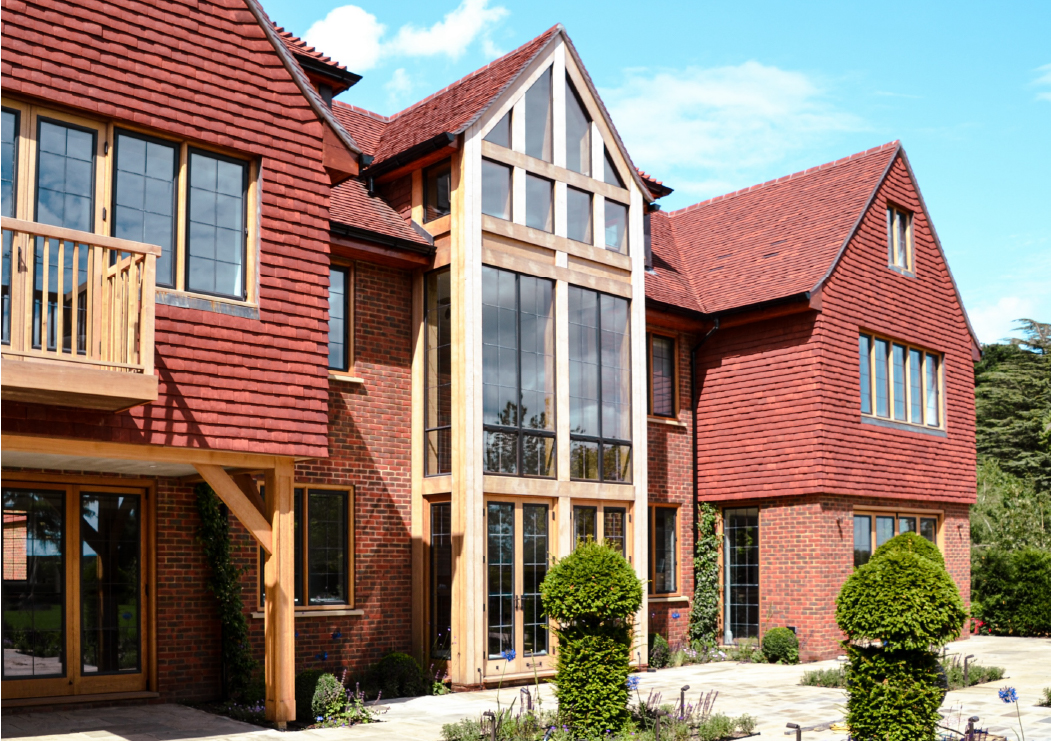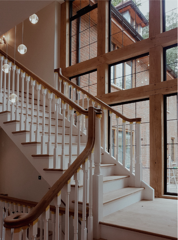 The stone entrance portico provides an appropriately grand entrance feature, while the three storey high green oak feature window on the rear elevation ensures that the hallway and staircase are flooded with natural light. The rest of the house has thermally broken metal casement windows in hardwood frames which look traditional but comply with current regulations.
