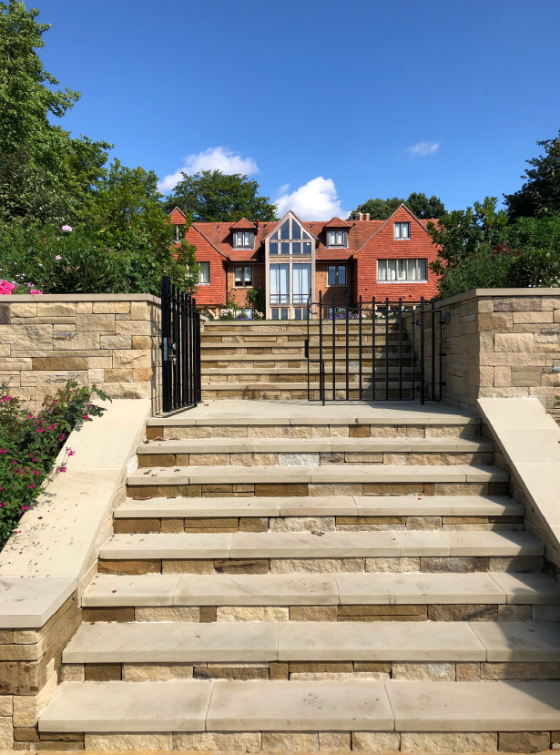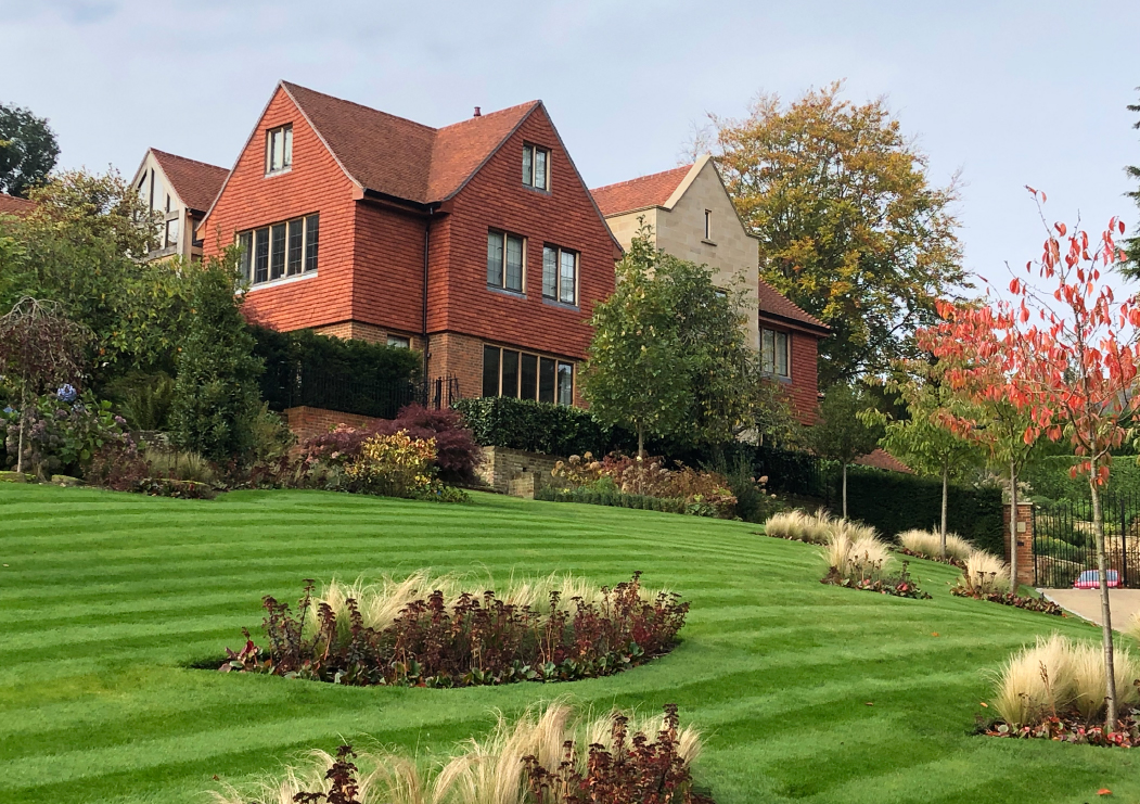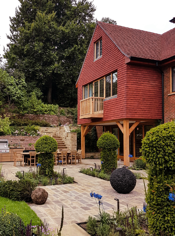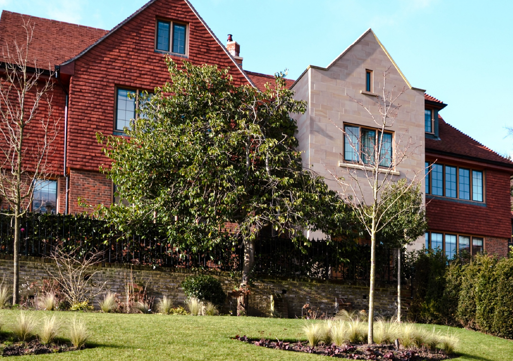 The siting of the house on a hill provides stunning views of Surrey. The garden was carefully designed and the use of hard and soft landscaping and split levels enhances this house in its setting.